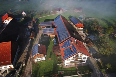 光伏電能巴伐利亞農場的屋頂太陽能電池板,當光束射到半導體(通常是硅)上時將產生電流。不像聚光太陽能系統,這是太陽能發電另外一種方式,光伏系統可以小規模的有效運作。